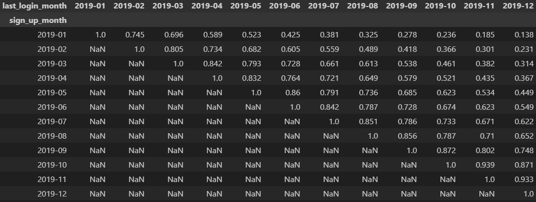 이렇게 1월에 회원가입한 유저가 2월에는 어느 정도 유지가 되고, 3월에는 어느 정도 유지가 되는지 확인할 수 있습니다.